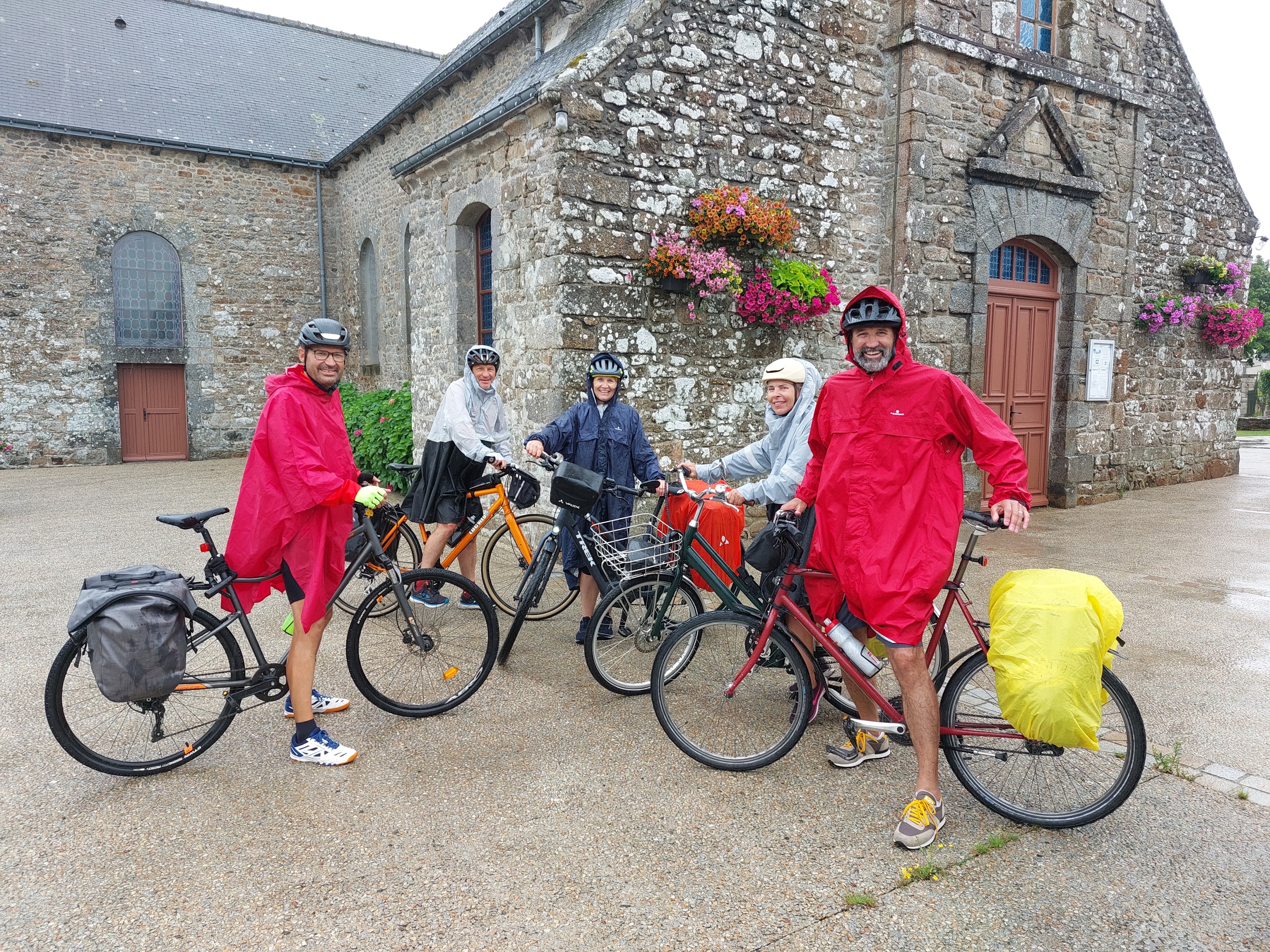 Elle était annoncée cette journée pourrie, venteuse et pluvieuse, je suivais son évolution depuis le début de la semaine car elle tombait le jour de notre plus grosse étape. Départ de Bréhat par la première navette de 8H sous une pluie battante, histoire de bien nous tremper dès le début de la journée. Une pause café à Paimpol et nous quittons la vélomaritime pour des petites routes de campagne désertes. Yvias, Lanleff, Le Faouët, Trévérec, Goudelin, Bringolo, Plélo… que des toponymes qui sentent bon la Bretagne. Nous alternons les passages en plaine parmi les champs de blé non encore moissonnés et les parcelles de maïs avec les longues descentes dans les sous bois obscures et humides. Toute la journée, nous avons l’impression de faire les montagnes russes, montée, descente, montée, descente… Nous sommes copieusement arrosés tout l’après midi. L’arrivée à Lamballe est un soulagement. Nous y faisons quelques courses pour pouvoir diner dans notre chambre d’hôtes à Plédéliac 12km plus à l’est. Pas besoin de berceuse ce soir.