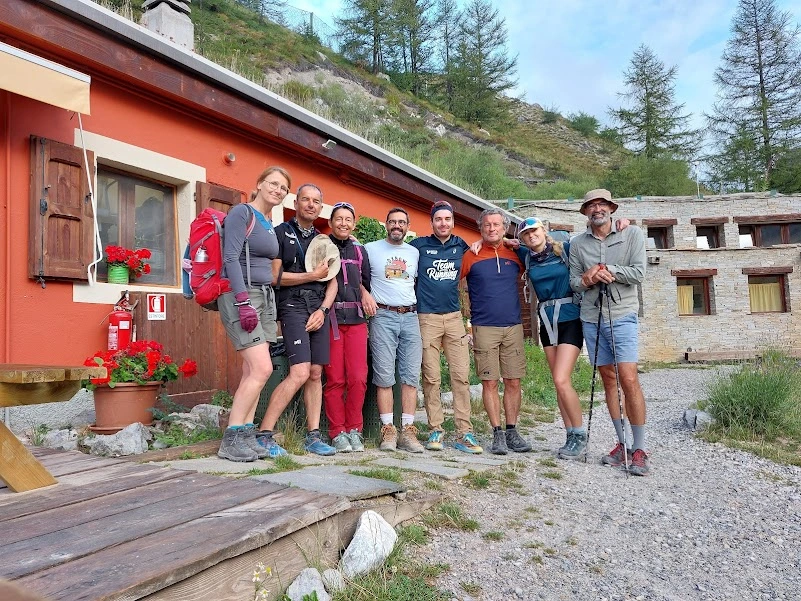 Pour gagner la frontière italienne nous optons pour le col de Marinet 2787m car la montée nous permet de longer deux superbes lacs d’altitude. Recroquevillé sous un névé encore épais pour cette fin août, le glacier de Marinet nous apparait dès l’arrivée aux lacs, avec sa couleur bleue si caractéristique . Parvenus au col de Marinet, nous redescendons au col de Mary pour rejoindre le chemin plus direct, la Via Alpina vers Campo base. Nous apercevons au sud le colle di Ciaslaras particulièrement raide, autre itinéraire possible. Nous pique niquons près du Lago della Sagna parmi des génisses Piemontese qui, de leurs beaux yeux surlignés, nous regardent incrédules. Longue descente vers le refuge de Campo Base. Lien vers le parcours : https://www.alltrails.com/explore/recording/suuntoapp-trekking-2024-08-26t06-47-31z-0f0d67e?u=m&sh=ffwrup