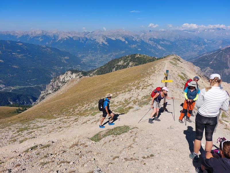 Les chaussures encore bien humides, nous attaquons la montée vers le Pic d’Escreins en suivant le GR de pays Tour de la Font Sancte. Nous avons 950m de grimpette jusqu’au col sous le pic. L’arrivée au sommet est de toute beauté, la vue est dégagée sur le massif des Ecrins à l’ouest, les crêtes de Vars au sud et le pic de Roquebrune au nord près du col de l’Izoard.